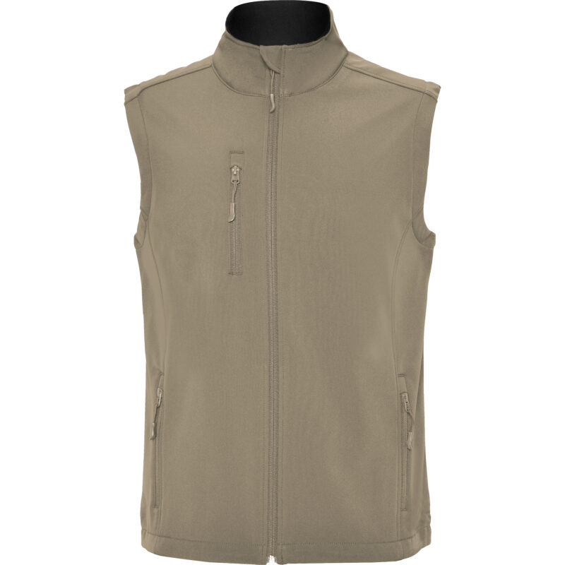 Chaleco softshell de 2 capas con cremallera frontal invertida. Interior en tejido micropolar. Repelente al agua. Dos bolsillos laterales y uno en pecho derecho con cremalleras invertidas. Protector de barbilla del mismo tejido invertido. Ajustadores laterales en el interior.