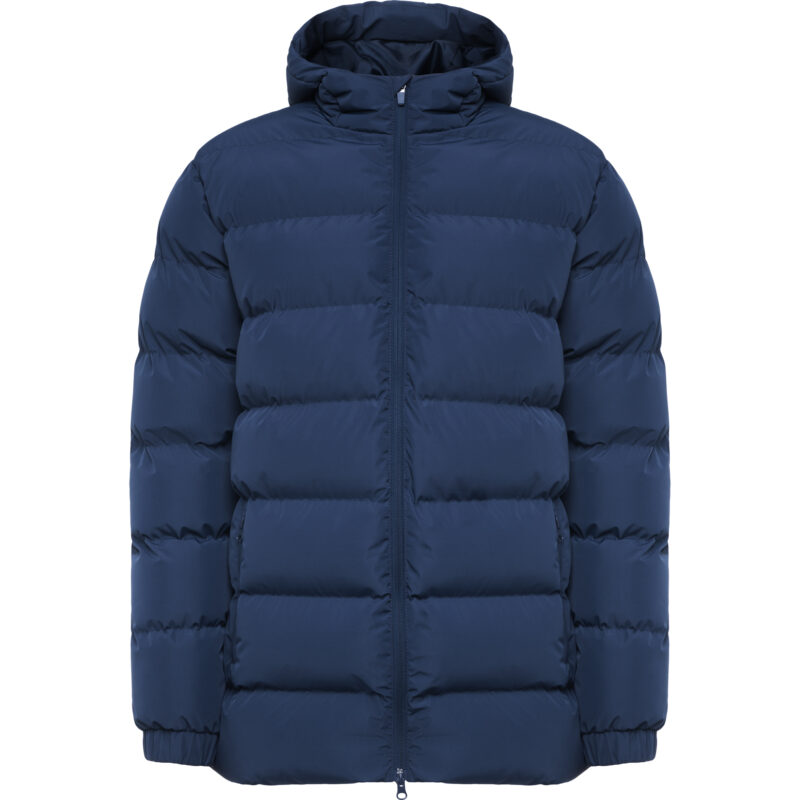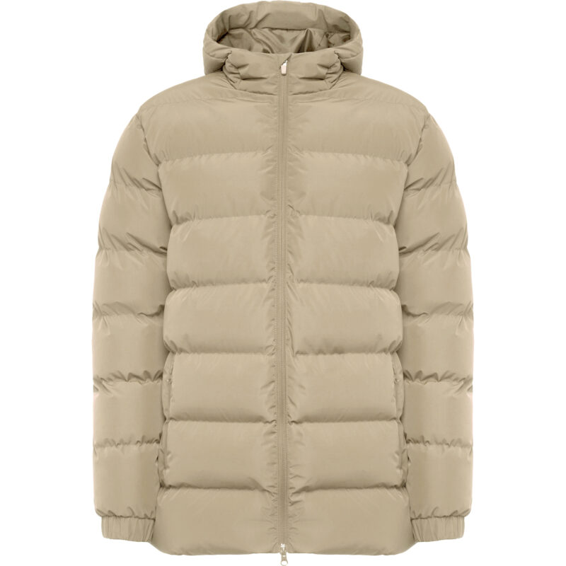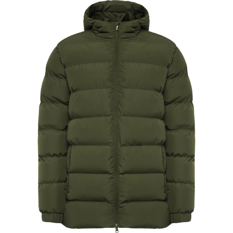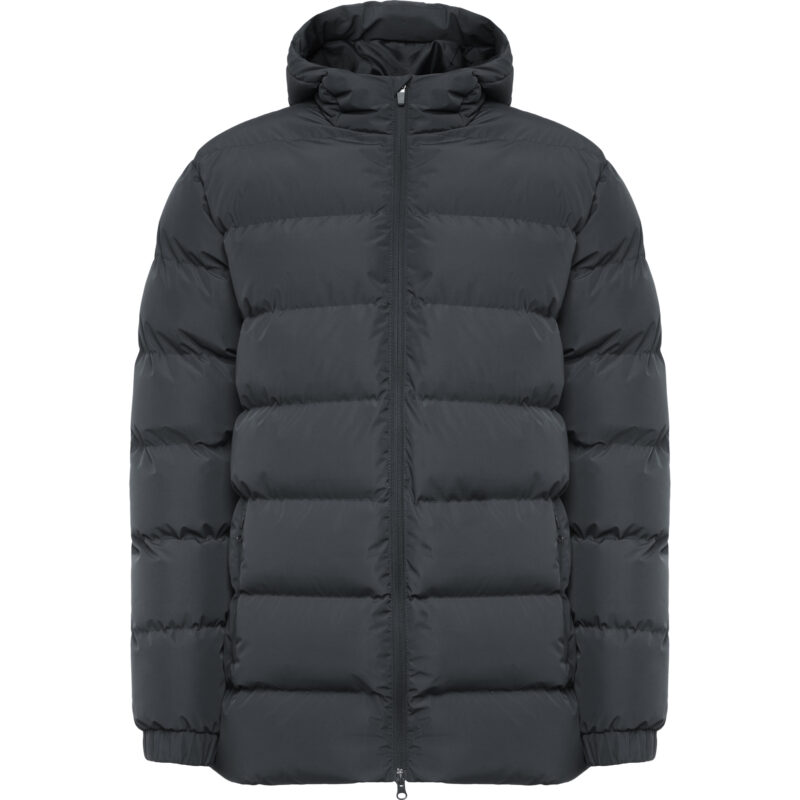 Parka acolchada repelente al agua con capucha fija y visera. Cremallera frontal al tono y tirador de doble dirección. Protector de barbilla del mismo tejido. Puños elásticos. Bolsillos laterales con cremalleras al tono. Bolsillo interior en pecho izquierdo. Acceso interior para reprocesos.