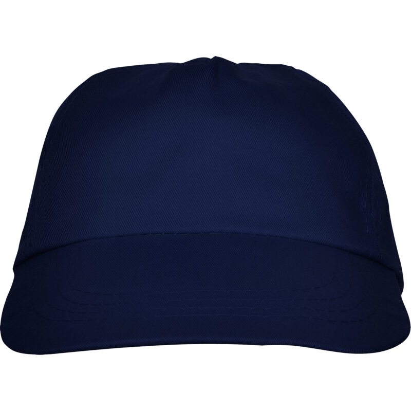Gorra 5 paneles. 2 agujeros de ventilación bordados. Con 4 líneas pespunte en visera, cinta interior antisudoral. Con cierre velcro ajustable en la parte trasera.