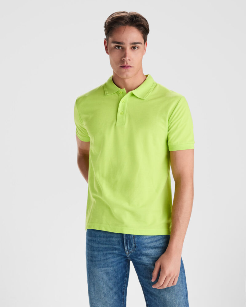 Polo de manga corta con tratamiento antipilling. Punto piqué. Cuello y mangas tejidos en 1×1 con detalle en relieve. Tapeta de 3 botones. Cubrecosturas en cuello del mismo tejido. Aperturas laterales en bajo. Bolsillo opcional. Admite lavado a 60º.