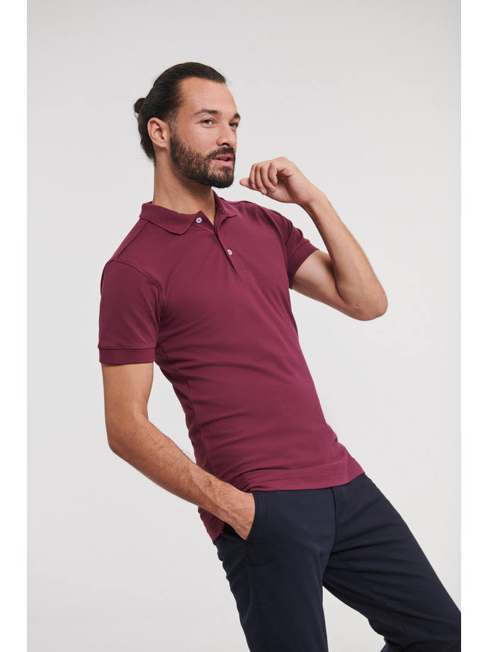 95 % algodón peinado hilado en anillo, 5 % LYCRA® *Light Oxford 88 % algodón peinado hilado en anillo, 7 % viscosa, 5 % LYCRA®. Blanco: 205 g/m² Colores: 210 g/m². Lavado de ropa a 40 °C o menos. Tacto suave. El polo más bonito y novedoso de Russell Athletic® llamará la atención de todos. Corte ajustado y largo. Estructura de piqué fino de nido de abeja.. Cuello fino. Botones en contraste. Puños ribeteados. Franja de tejido del mismo color en el hombro. Aberturas laterales más cortas con cinta de punto de espiga.