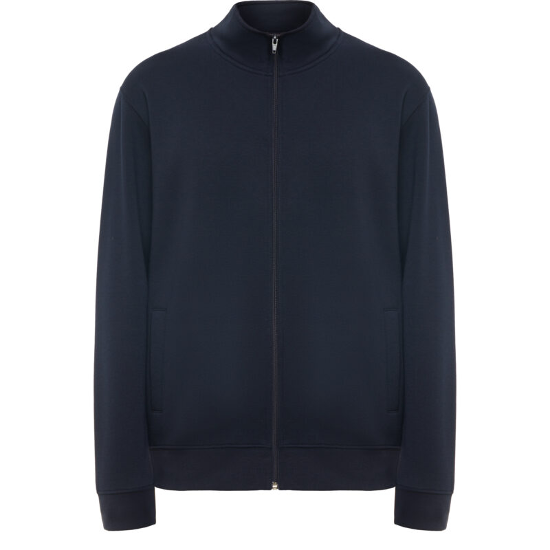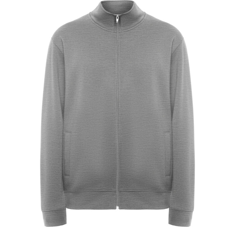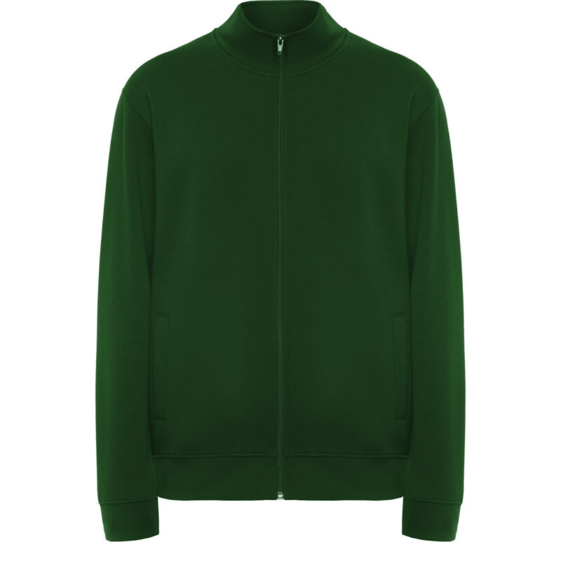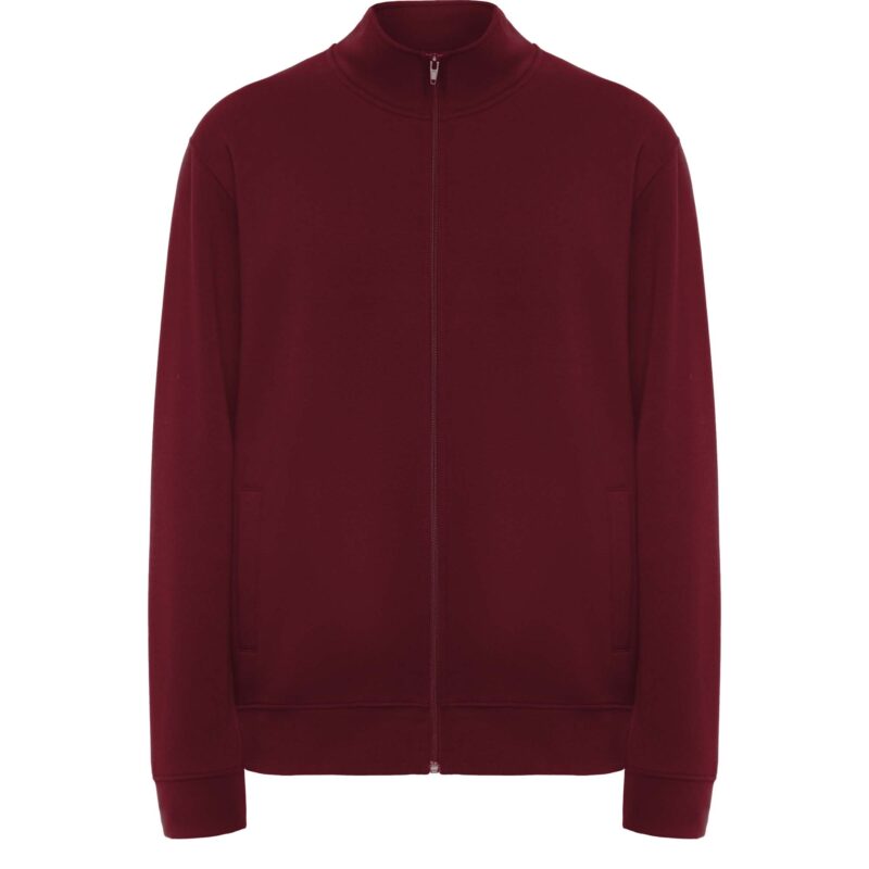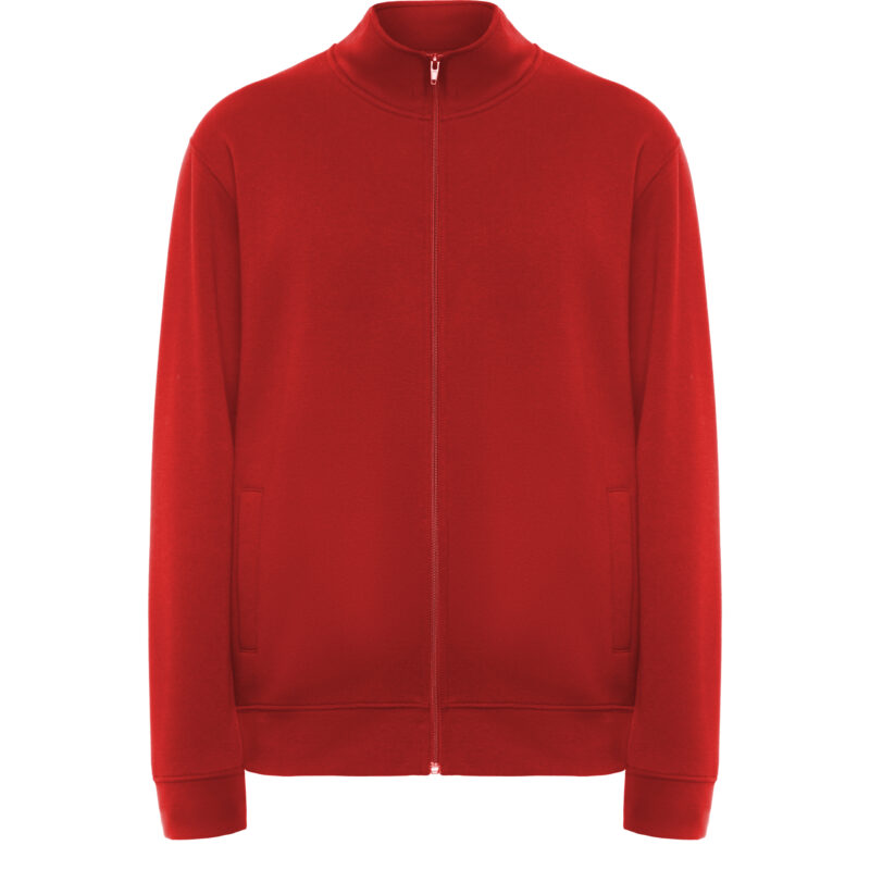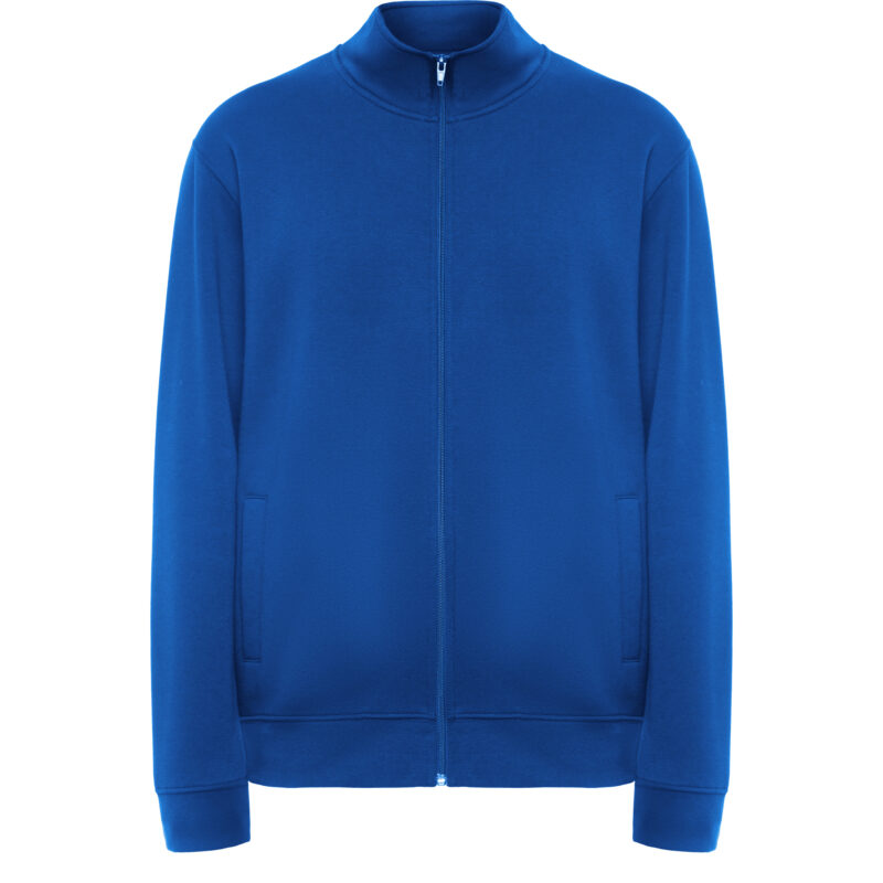 Sudadera unisex con cremallera frontal y cuello alto. Cremallera al tono. Dos bolsillos laterales con ribete del mismo tejido. Puños y cinturilla en canalé 2×1 con elastano. Cubrecosturas del mismo tejido.